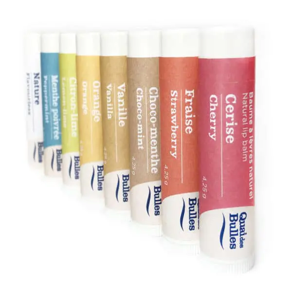 Beurre de karité certifié équitable et certifié biologique, huile de son de riz 1re pression, beurre de cacao, cire d’abeille, huile de pépins de raisins, saveur ou huile essentielle.