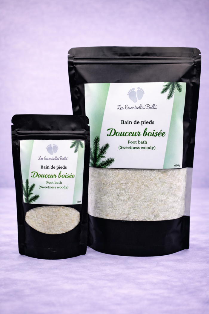 Le bain des pieds est une pratique ancienne qui consiste à tremper ses pieds jusqu’aux chevilles dans de l’eau tiède à chaude. Agréable pour se détendre mais aussi profiter de plusieurs bienfaits reliés aux huiles essentielles qu’il contient. Ce sel de pieds est conçu pour apaiser les pieds fatigués. Les pousses de sapin moulus ainsi que leurs huiles essentielles favorisent un sentiment de calme ! Respirez les notes résineuses et boisées qui vous enveloppent, vous réchauffent !