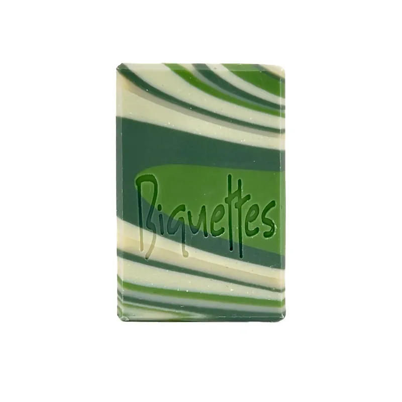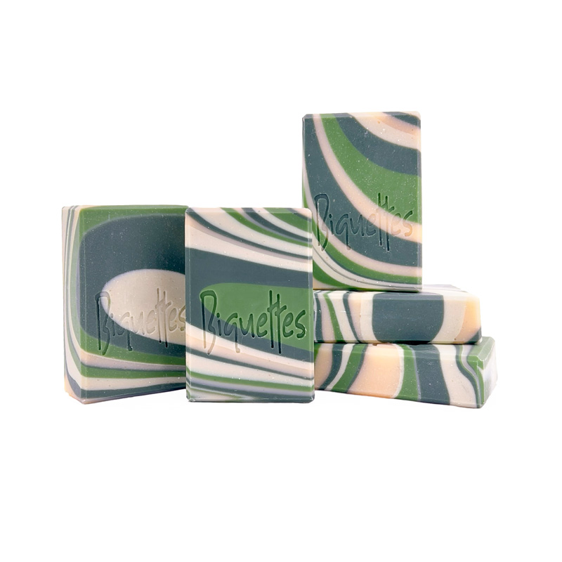 Le parfum caractéristique, résineux et herbal vous transportera dans en pleine forêt. Pour les amateurs de nature, de plein air et de parfum « forestier ». Il est parfumé avec de l’huile essentielle de sapin baumier d’origine québecoise. Sur une note plus technique, son marbrage se nomme le « spinning swirl ». C’est le même marbrage que les savons à la lavande et romarin, pivoine et aussi celui d’encens et patchouli. Il est coloré, entre autres, avec de l’argile verte et durant le temps des fêtes, j’y rajoute une touche festive avec de l’argile rouge ! Produit composé de 70% d’ingrédients locaux !
