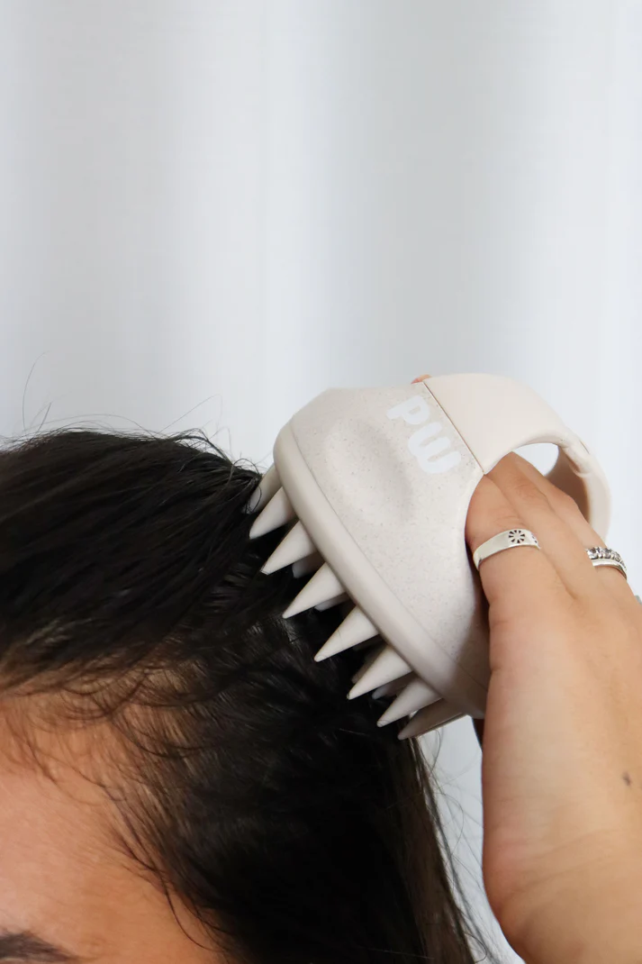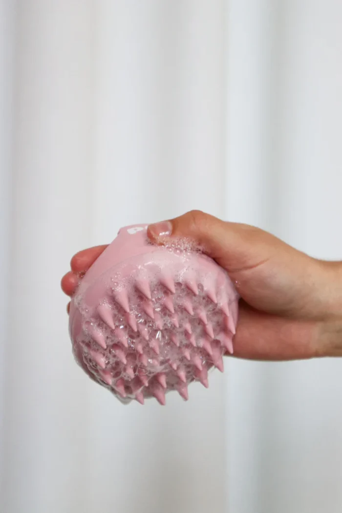 Sur cheveux mouillés, applique ton shampooing puis masse le cuir chevelu avec l’outil en effectuant des mouvements circulaires.