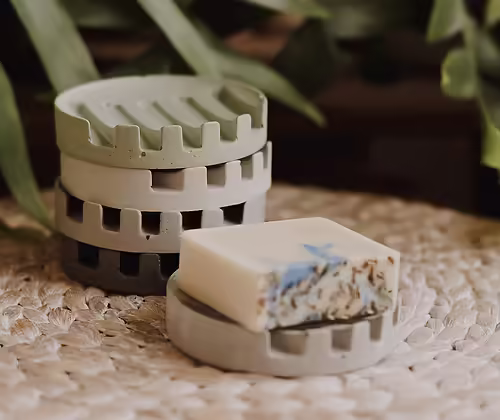 Porte savon en béton fait a la main En dessous, il y a quatre petites pattes de caoutchouc pour éviter le glissement. Scellé mat. Fabriqué à la main à Granby, Canada. Il y a de légères variations dans les bulles d’air et les tons des portes savons, ce qui rend chacun magnifiquement unique !