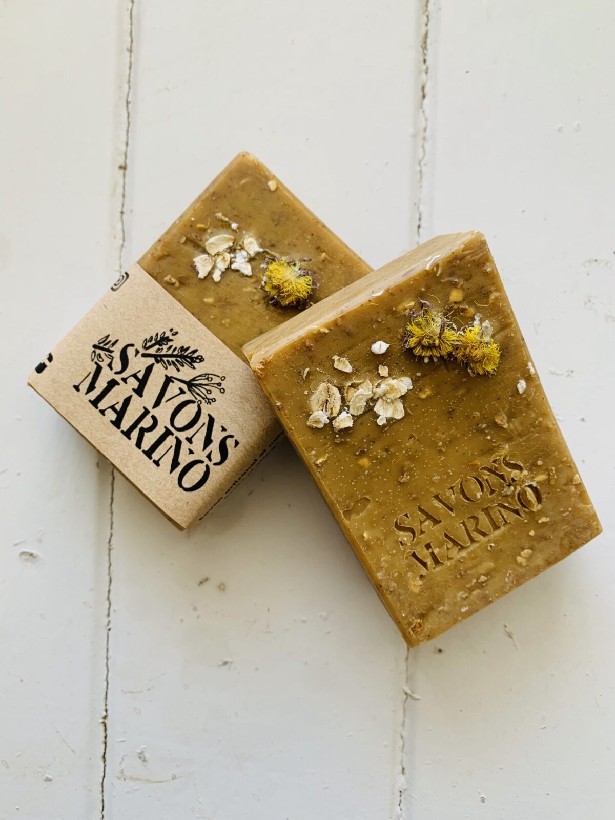 Ingrédients : Huile d’olive, beurre de noix de coco, beurre de cacao, huile tournesol, beurre de karité, huile de ricin, huile canola, eau, soude caustique, pulpe d’argousier, avoine colloïdale, cire d’abeille, argile, curcuma, huile essentielle d’orange douce, fleurs en décoration/ olea europaea (olive) fruit oil, cocos nucifera (coconut) oil, theobroma cacao seed butter, helianthus annuus (sunflower) seed oil, butyrospermum parkii (shea)butter, ricinus communis (castor) seed oil, canola oil, water, sodium hydroxide, hippophae rhamnoides fruit extract, avena sativa, cera alba, argilla, Curcuma longa root powder citrus sinensis (orange) peel oil, flower
