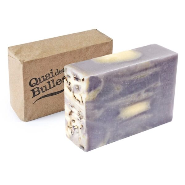 Ingrédients : Huiles saponifiées de son de riz, de coco, de palme biologique, de canola, eau, HE de lavande, beurre de cacao, lait de chèvre, fleurs de lavande, pigment.