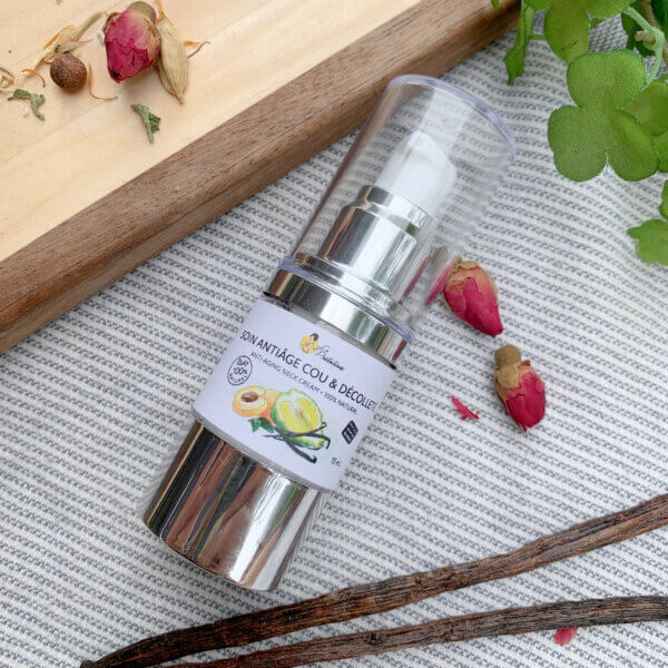 Mode d’emploi : Prélever quelques pompes du produit et appliquer sur la peau propre du cou et du décolleté.