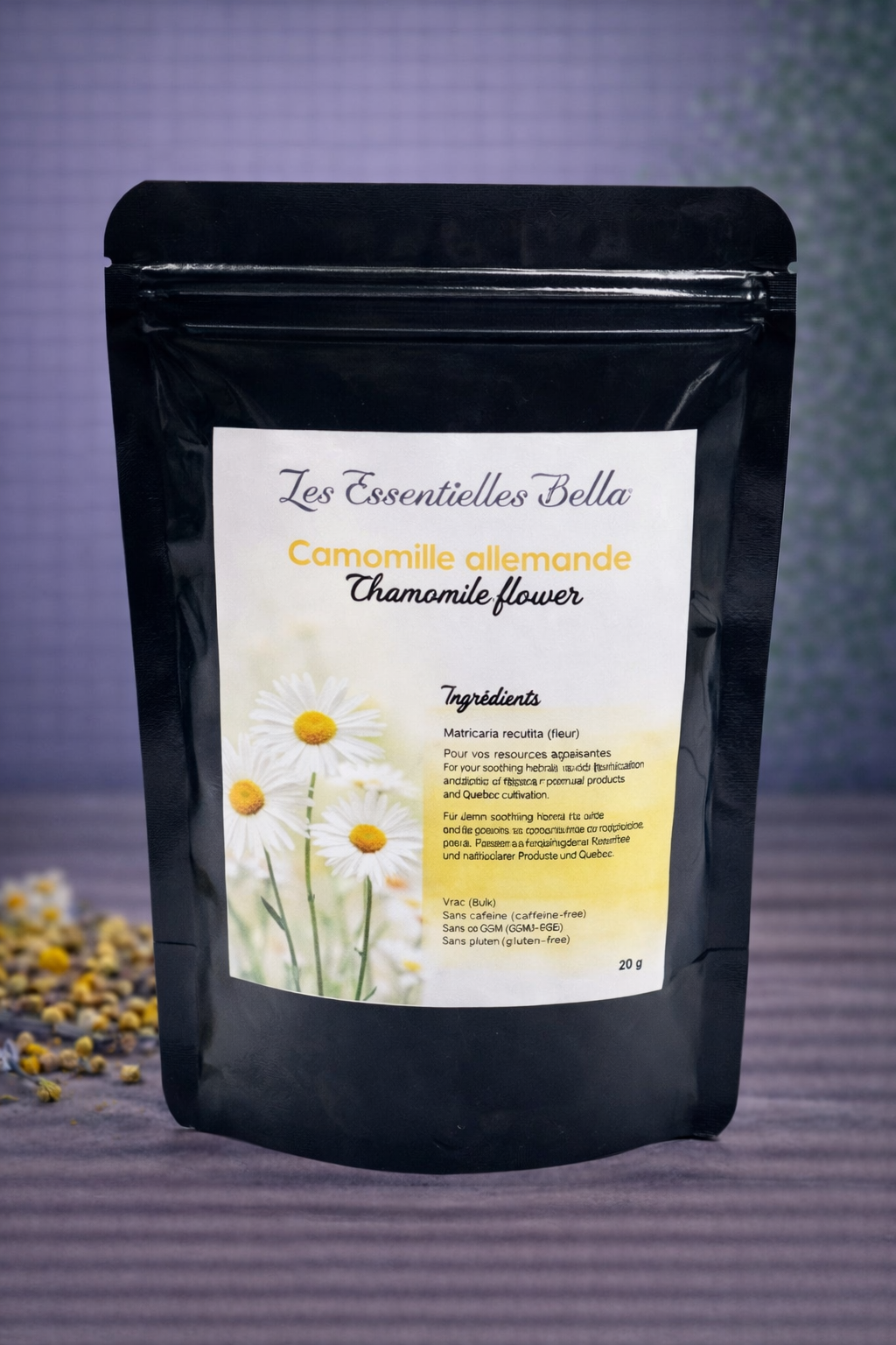 La camomille aussi appelée matricaire est une plante herbacée de la famille des astéracées, une plante médicinale dont on ne cesse de vanter les vertus, qui est cultivée dans le monde entier avec son goût sucré comme le miel, mais un peu amère. Elle est antioxydante, calmante et relaxante lors d’une bonne tisane. Elle est aussi riche en sesquiterpènes.