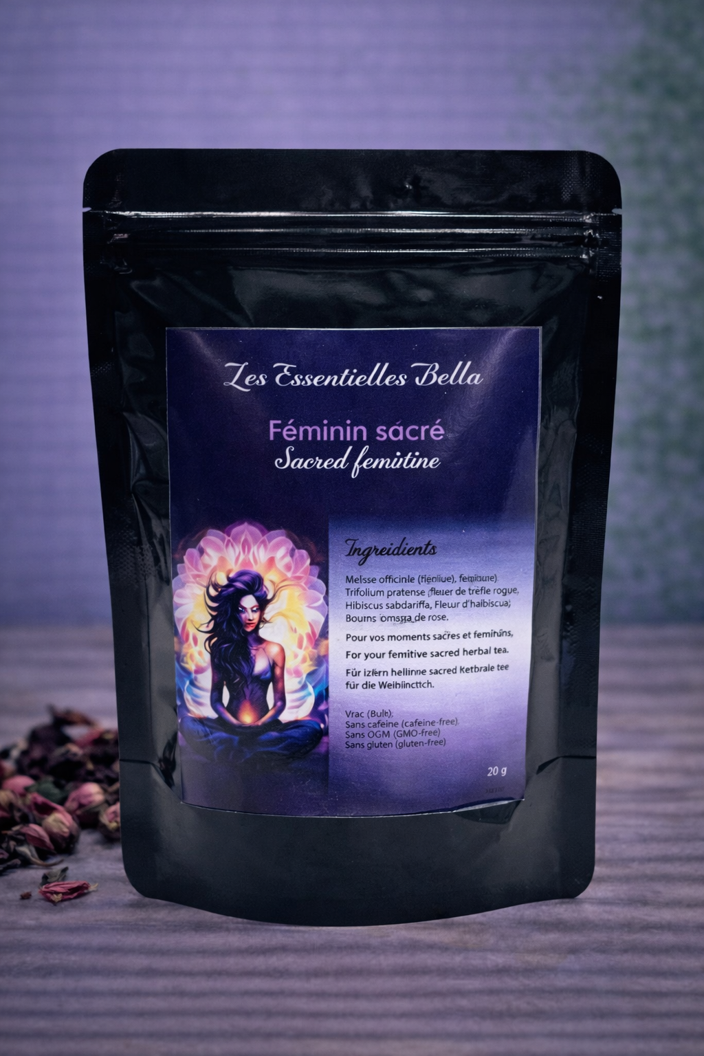 Cette tisane est conçue pour la femme. Elle a été composée des meilleures plantes alliées de l’utérus. Elle soutient le bien-être et la sphère hormonale des femmes et leur SPM, en favorisant un équilibre. Le féminin sacré signifie beaucoup plus encore, car elle représente la femme. La femme a en elle une puissance inimaginable. Le féminin sacré, c’est cette connexion avec la déesse-mère et cette puissance qui nous anime et nous appelle à l’honorer.